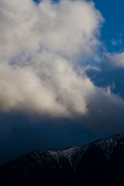 deep pure blue skies with fluffy white clouds drifting around the peaks