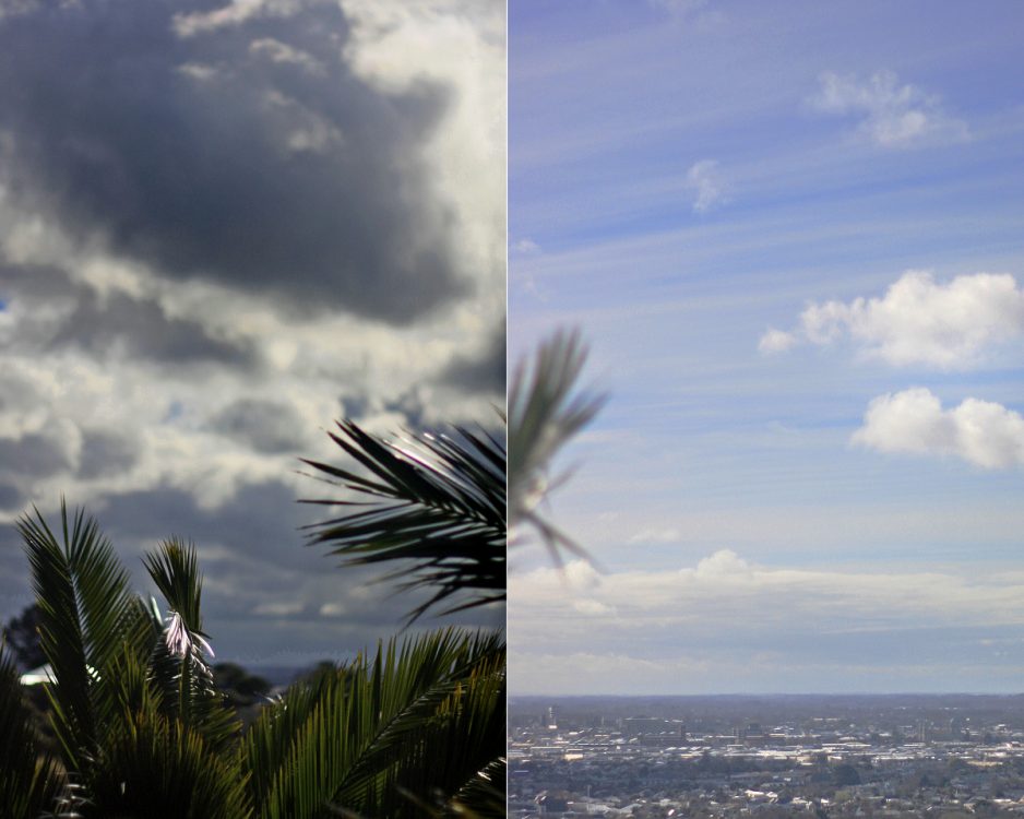 Strange day today so I experimented. I stood on our deck and took two photos – one each side of the palm tree.