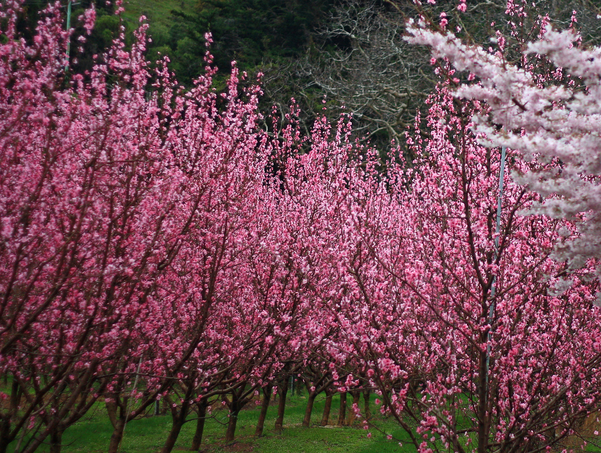 Went for a drive to Little River for lunch then on to Akaroa, through very green and lush farmland …….. until around a corner we go and a mass of brilliant bright pink blossom trees appear before us. They are in a very sheltered valley so have the water sprinkers ready for frost fighting.