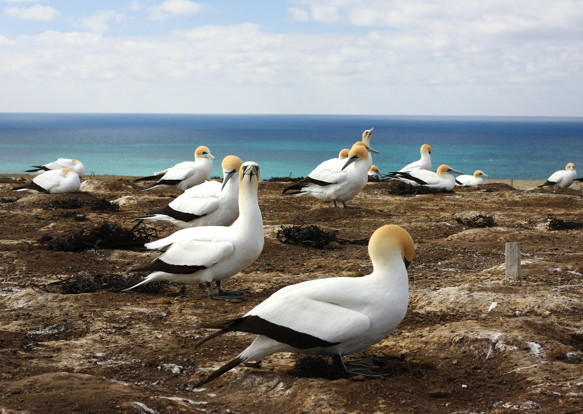 They are spectacular birds with a 2 metre wing span and look beautiful in [url=http://www.flickr.com/photos/35200801@N05/3894400503/in/set-72157622276954412/]flight[/url]. The males build the nest from seaweed, so many of them were flying into the colony with beaks laden with seaweed. They pair for life and are starting to lay eggs now which will hatch in 4 months time, then 4 months after that the chicks will make their first flight which is non stop to Australia, [url=http://www.flickr.com/photos/35200801@N05/3894376597/]returning[/url] 3-4 years later to nest. This colony is one of 4 at Cape Kidnappers, on a very exposed windy cliff edge