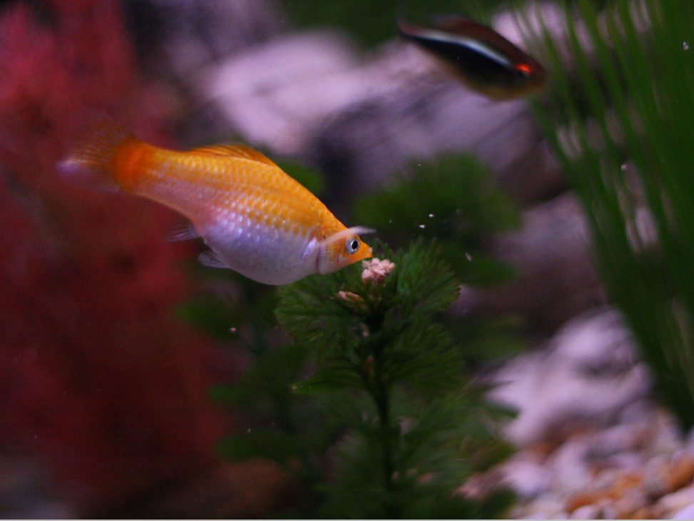 One bonus for the clever fish is that the food can get trapped on top of the plants – and this wee fellow is making the most of that and won’t let anyone else near ‘his’ plant ……not sure if he is fat cos he is cunning and gets more food …… or if he’s a she and pregnant. Time will tell I suppose.