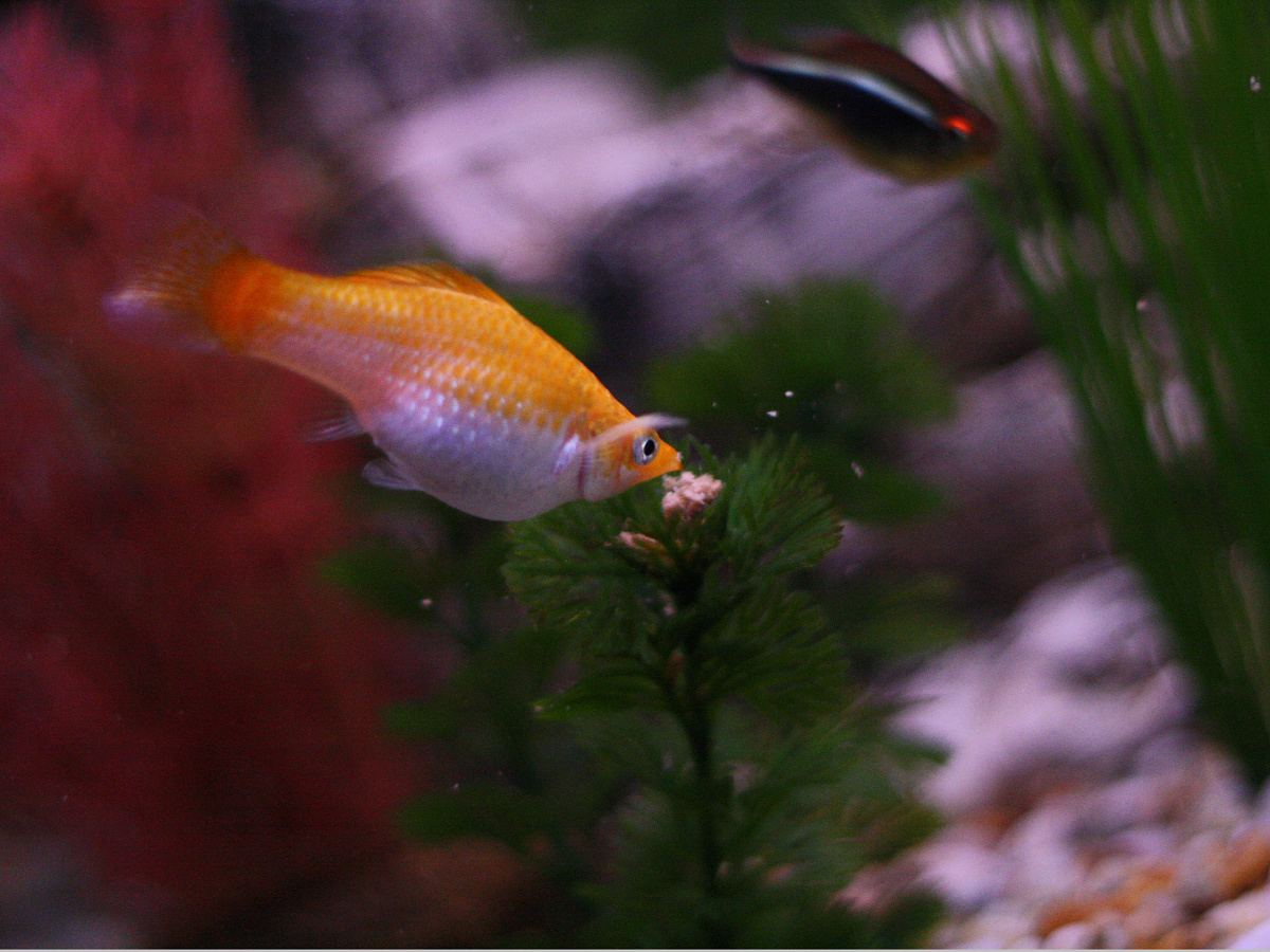 One bonus for the clever fish is that the food can get trapped on top of the plants – and this wee fellow is making the most of that and won’t let anyone else near ‘his’ plant ……not sure if he is fat cos he is cunning and gets more food …… or if he’s a she and pregnant. Time will tell I suppose.