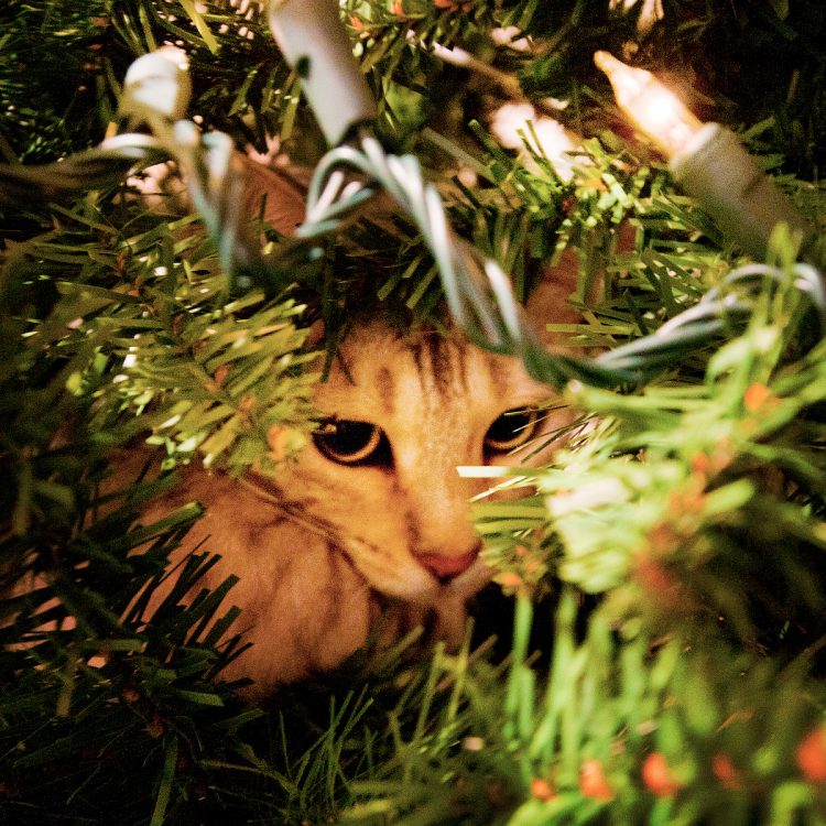 Our little Pixel had silently climbed 5 feet up the tree, stealthily stalking the lights