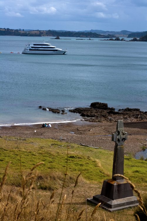 This image is from the shore looking towards our boat and Kerikeri in the distance behind the hills. The cross is a memorial to Samuel Marsden – a missionary who preached the first sermon in NZ – on this beach at Rangihoua Bay on Christmas Day 1814. It is the site of a missionary settlement where the first pakeha child was born in New Zealand