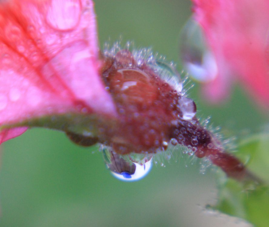 Today the rain reduced to showers, the sky lightened ever so slightly, and there was a hint that the sun is still there somewhere behind the clouds. I was intrigued by the mass of rain droplets on the hairy stem of my pelargonium ……….. and the reflection in the bubble is a blue pot sitting on our deck – no photoshop tricks today, this is exactly as I took the photo with my lensbaby.