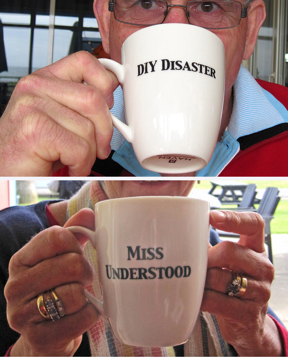 Took heaps of photos of 90 mile beach, sandboarding on some very high sand dunes, the Cape Reinga lighthouse, Spirits bay, and Cape Maria van Dieman … but I have chosen the mugs in which our mid morning coffees were served 🙂