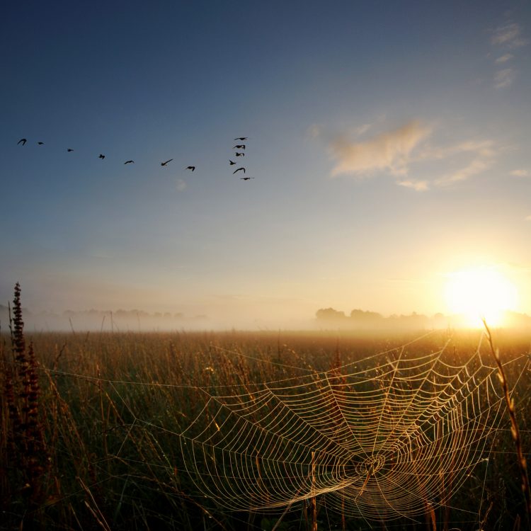 The local geese are heading south as the sun rises through the autumn mist.