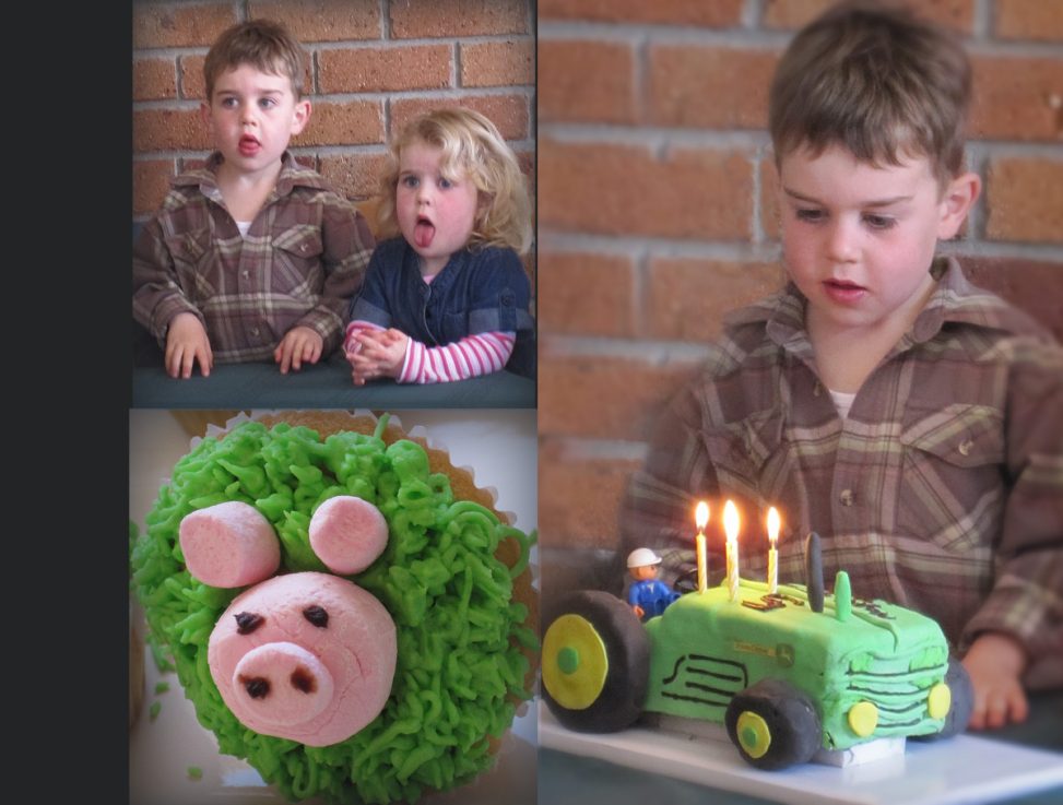 He had a farm theme party hence the pig cupcakes and the John Deere tractor cake ….. and I do like the photo of him with his sis, waiting in anticipation of the yummy birthday cake which was about to arrive ( not sure their mum will be so impressed with the image tho!!)