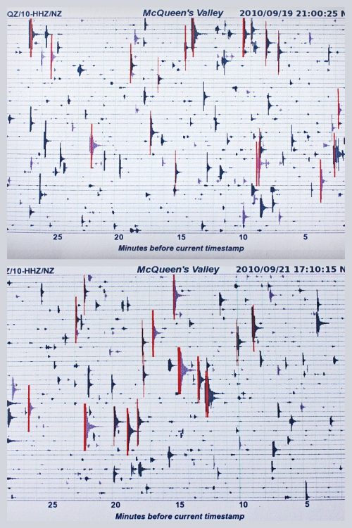 Like most people in Canterbury we are regularly checking [url=http://www.geonet.org.nz/earthquake/drums/mqz-drum.html]geonet[/url] to see what is happening underground. The first week showed masses of red on the seismograph and we were having 30 strong tremors a day. The red lines indicate the intensity of the quake but we don’t feel all of them – just the occasional quick jolt or a slight rumble and tremor. Each graph covers a 24 hour period – the top graph was 2 days ago and the lower graph shows the past 24 hours,