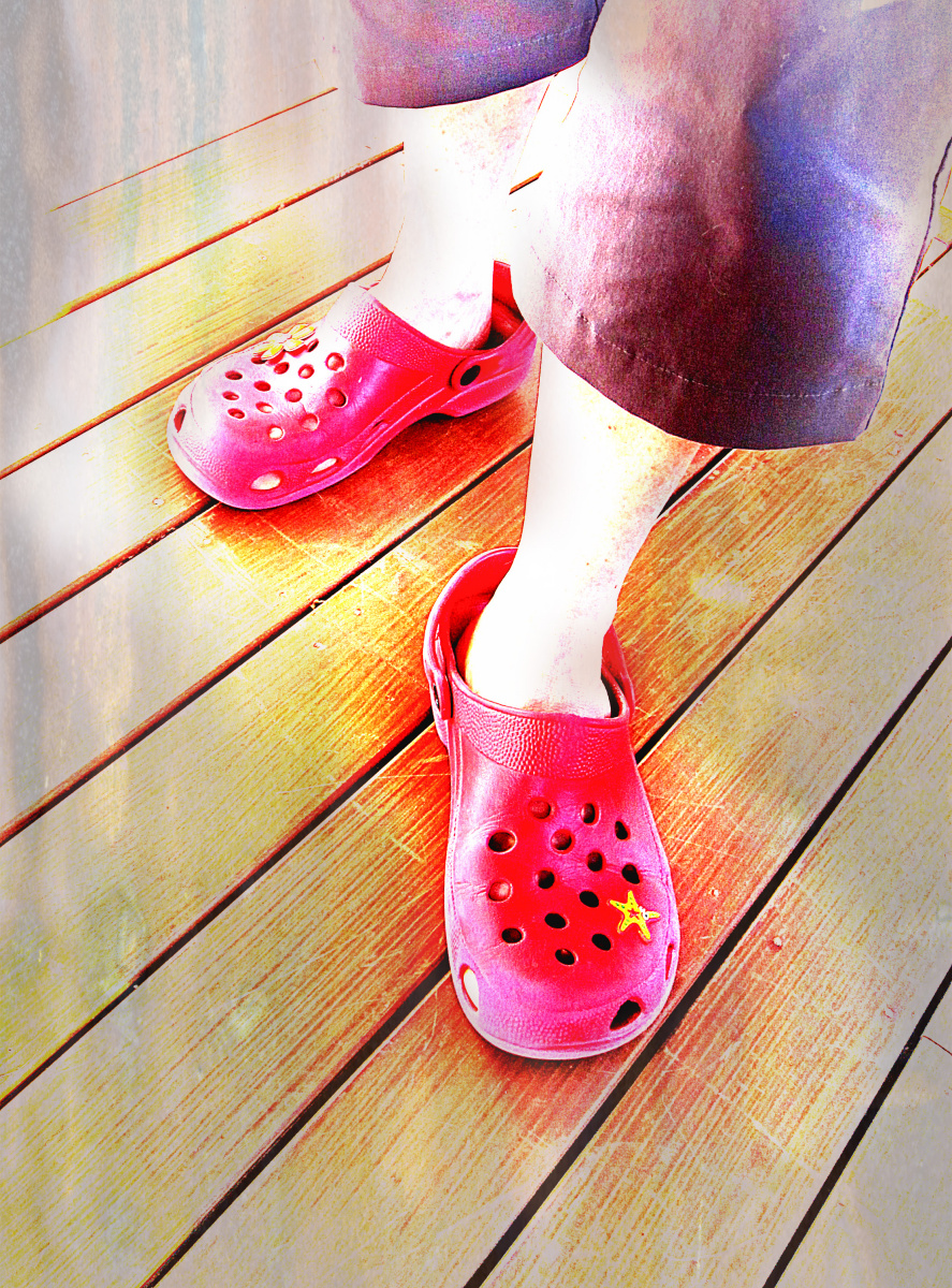 Picked her up an hour late and were tootling along in my [url=http://www.blipfoto.com/view.php?id=746633&month=9&year=2010]clean[/url] car when there was a shriek of “Oh no!! I didn’t change my slippers”!! They look like crocs to me ………. but apparently they are [u]never[/u] worn out in public …… until today 🙂
