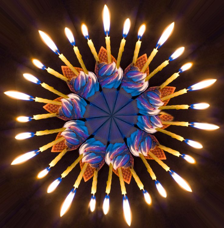 [i]Edit – Tx for all your comments ………….. but I am not as creative as many of you believe. I did not bake a stunning birthday cake, but took a photo of a cupcake with three candles on it, copied adn pasted it several times to a create a panoramic image, then resized into a square image, rotated it, and made into the circle using polar co-ordinates. Quite simple really and I like the result :-)[/i]