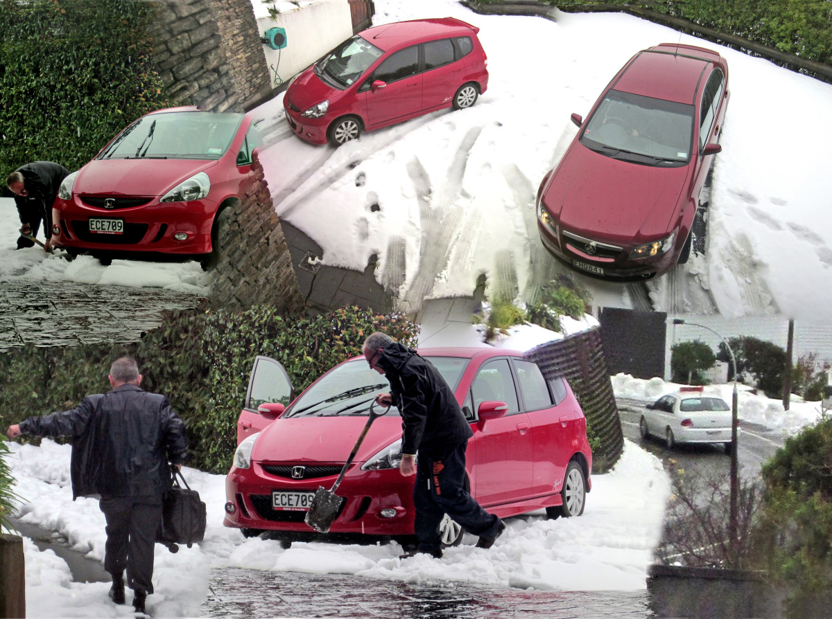 gd had cleared the steep part of our drive yesterday, but didn’t expect to get stuck on the flat after a lot of rain today. It is so cold the snow is melting very very slowly, and all our snow gear is at Hanmer because we will need it there – might have to revise that plan!!