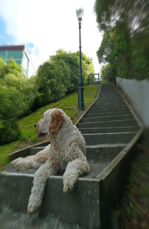 Today we walked down first, then around the river, posted some mail, bought some milk, then back up the hill and the steps before we were home again. This is one of six sets of the steps, and about half way up molly decided it was a good time for a rest …………. and to take time to check out what the neighbours were doing