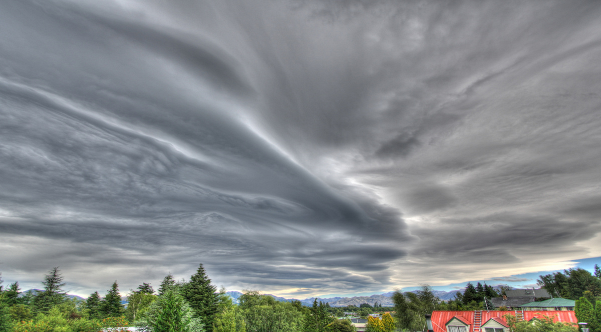 The clouds are swirling because a cold front from the south is meeting a high pressure system in the north creating our infamous Canterbury norwest arch (seen in the distance above the little bit of blue sky).