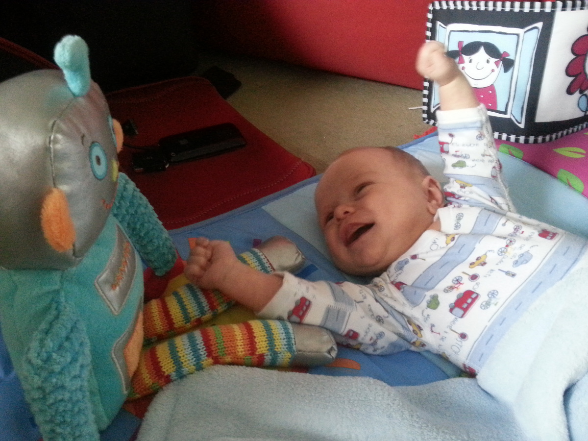 Although CJ is not really playing with his toys yet, we have been showing him his robot most days and this was CJ’s reaction when I brought it out today.