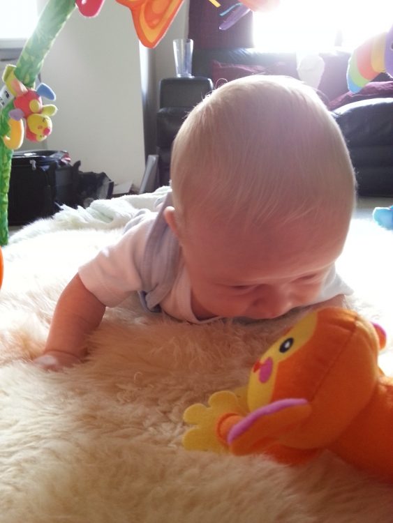 CJ loves his rainforest gym and the bright colour animals that hang from it.