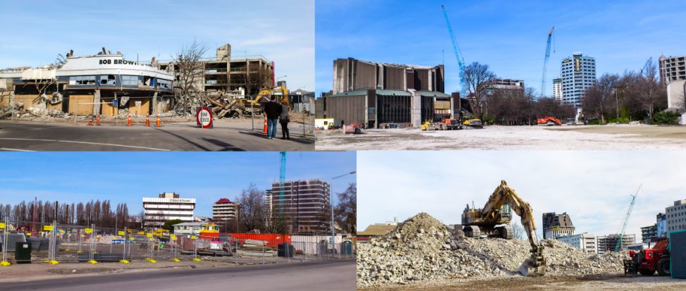 lower right – Radio Network building after implosion in Gloucester St, but there is no Grand Chancellor in the background, and the Westpac building is almost gone.