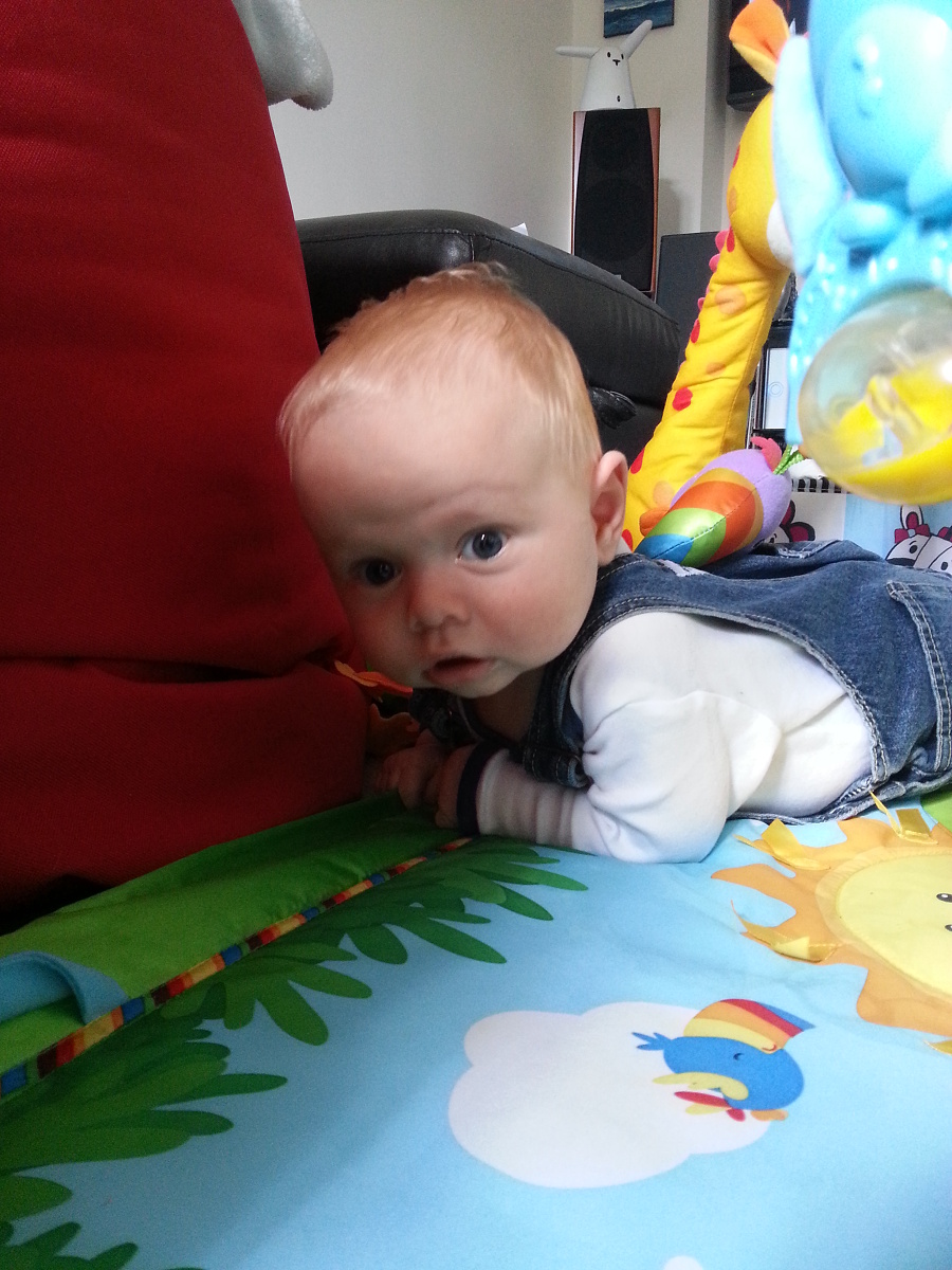 CJ is now rolling from his back to his front more regularly. He also spends a lot of time on his tummy trying to figure out how to get further down the play mat. Needless to say he gets very frustrated at not being able to move…