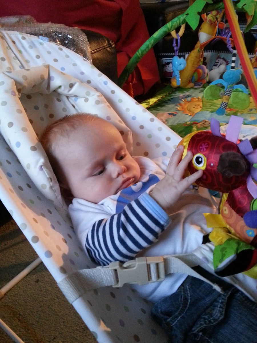 CJ has started grabbing hold of items and really exploring them (look, feel and taste). Just look at the concentration on his face as he explores Sir Prance-a-lot!