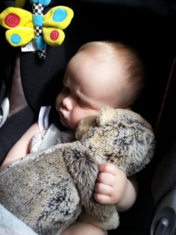 Bug and Puddle monkey… and sleep in his car seat.