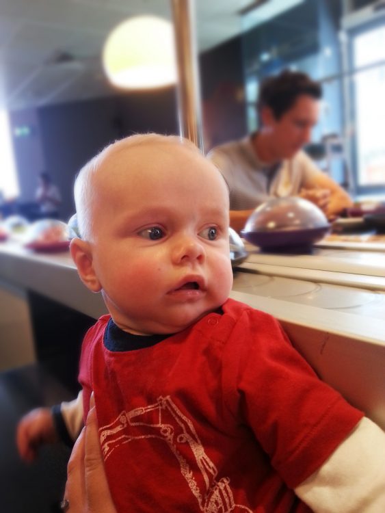 Today we went shopping with N&C. It was lovely to keep busy. We did some shopping and then decided to have lunch at the local sushi bar. They have a conveyor belt that carries dishes of sushi around the tables – you can then pick what dishes you want. CJ couldn’t take his eyes off the brightly coloured dishes as they zoomed past the table in a never ending train!