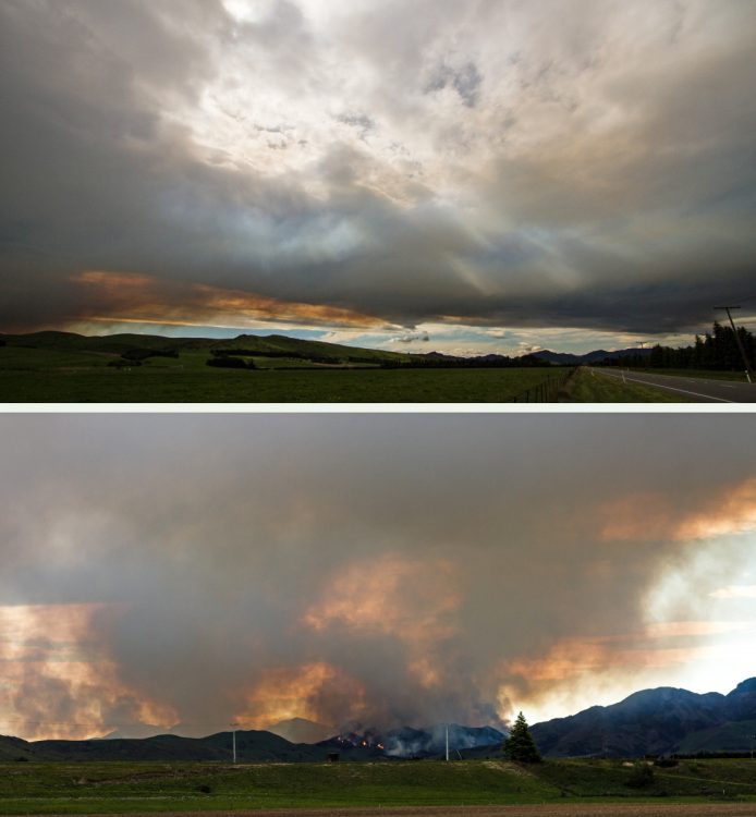 Just leaving Hanmer when we saw a huge plume of smoke in the sky ahead. As we drove toward Christchurch the source was apparent …………… an enormous fire in a valley near Culverden. We could see it for miles as it created a bit of drama in the skies.