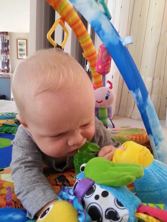 CJ always needs to fully explore his new toys. This involves a lot of staring, then a lot of grabbing and the occasional throw. But it always ends in a lot of biting. This new toy is even better than most because it has a special teething section attached.