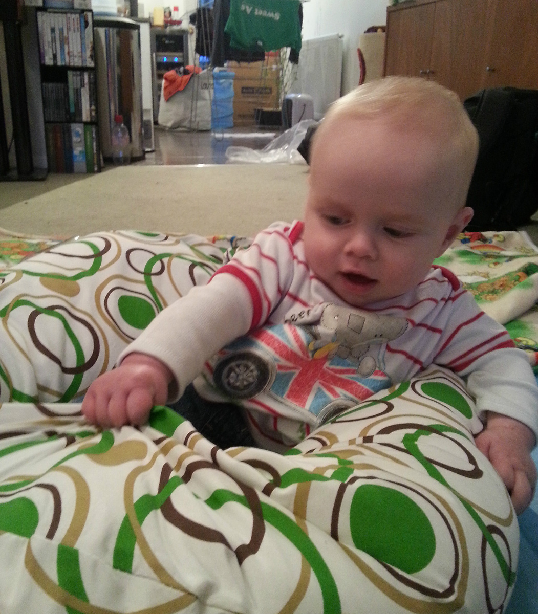 To help CJ sit without me holding him, I brought out my breastfeeding pillow to provide support. However, this turned into a great game of “tip-up” as he grabbed the pillow at his feet and then lent backwards!