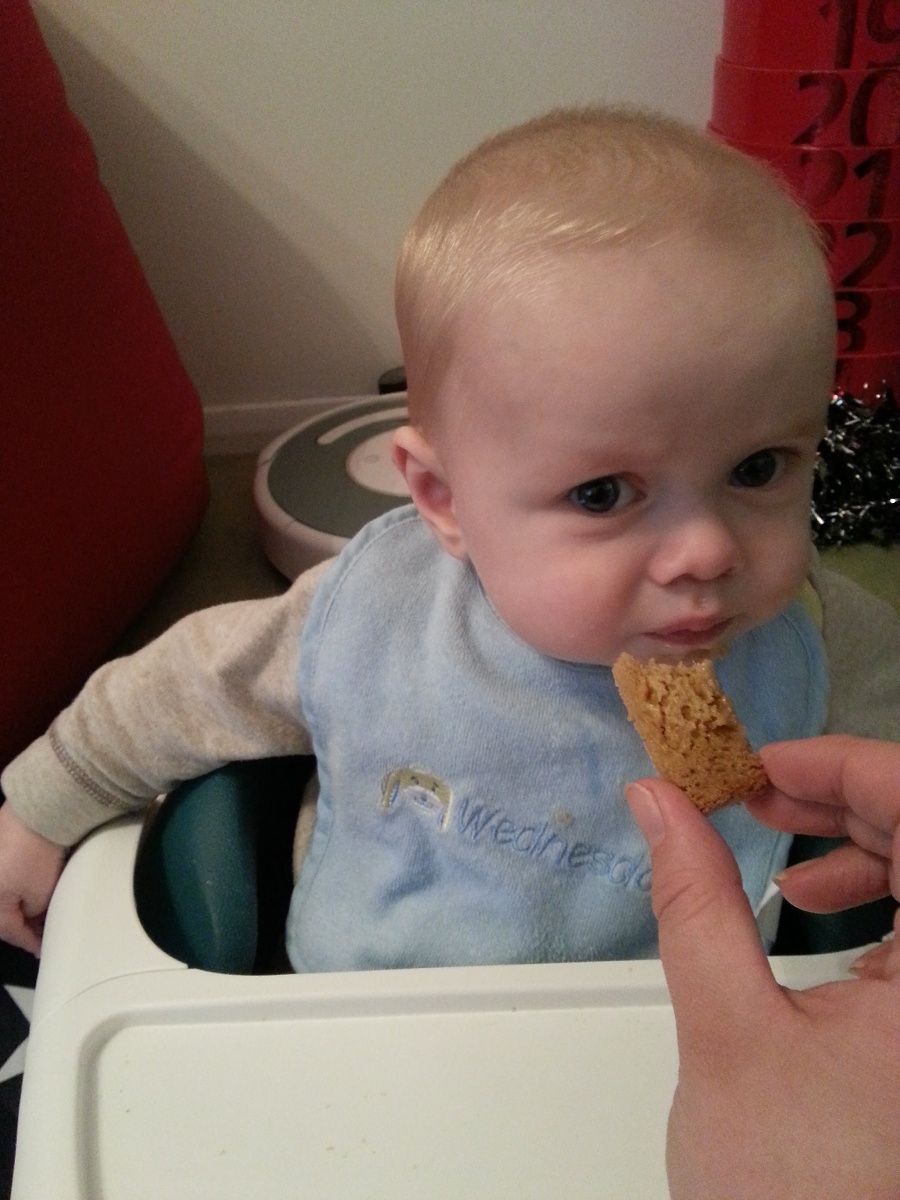 To try to help put the weight back on, the health visitor suggested trying other foods and not just the purée’s. So for breakfast today (after his porridge), CJ had his first taste of Gluten Free bread. He was not amused by this change to routine.
