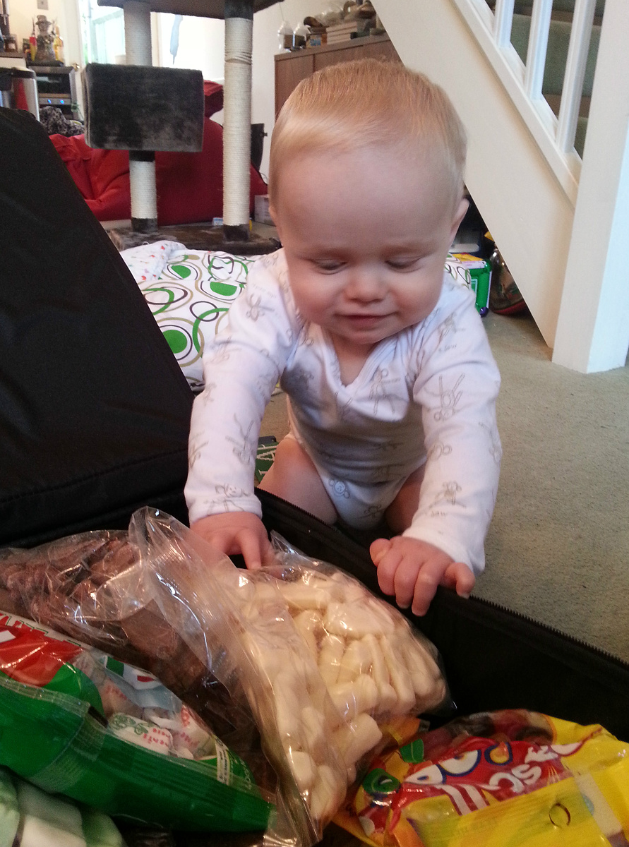 CJ help me unpack the suitcases today, however he was a little confused about the size of his milk bottles!