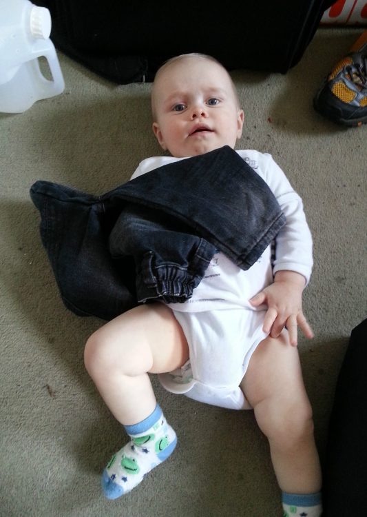 An unexpected hazard of crawling is that CJ loses his trousers! He has out-grown the previous size in terms of length but isn’t quiet big enough for some of his current size waistbands, so every so often I need to get him dressed again! On the plus, they make great toys once he has crawled out of them!