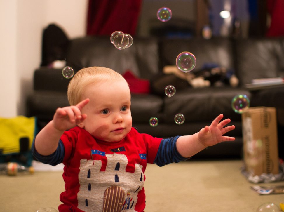 This afternoon while S2 was cleaning the oven it was my job to keep CJ from the kitchen. So out came the standard toys but the noises from the kitchen were too much and he was determined to investigate. Time to bring out the bubbles! He was fascinated by them as they floated down and settled on the ground – but they disappeared before he could grab them!