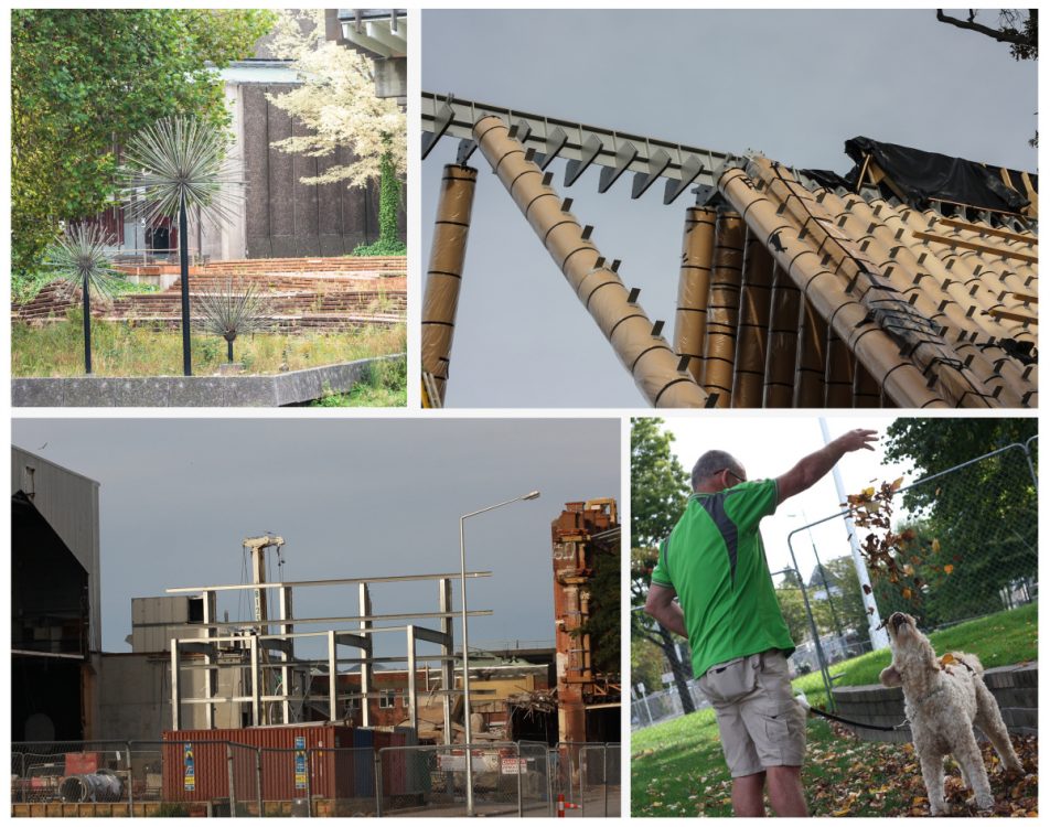 Top right is the new cardboard cathedral (a temporary replacement for the cathedral), and lower left is the Theatre Royal – the right hand side of the image is the original facade and on the left side is the stage and orchestra pit, and the centre gap was the auditorium and foyer. This section is being rebuilt to replicate the original Edwardian theatre using many of the key heritage structures which were retrieved after the quakes.