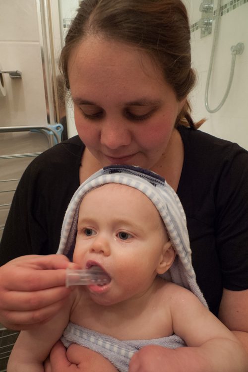 We started by just using baby toothpaste and our fingers but now that there are teeth top and bottom this has become a lot more hazardous! So we have switched to a finger brush which he loves! Although with new teeth appearing I think we will be switching to a proper tooth brush very soon!