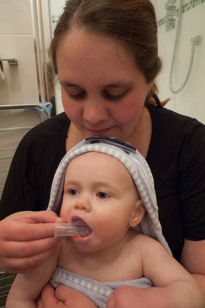 We started by just using baby toothpaste and our fingers but now that there are teeth top and bottom this has become a lot more hazardous! So we have switched to a finger brush which he loves! Although with new teeth appearing I think we will be switching to a proper tooth brush very soon!