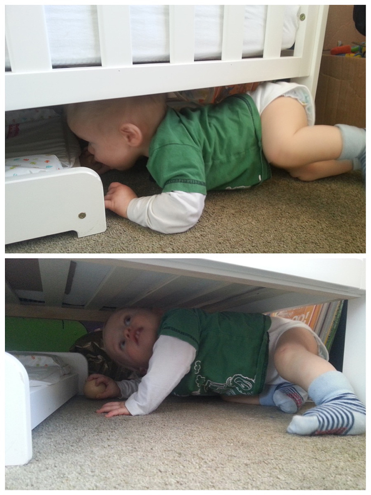 While trying to escape having his jeans put back on after a nappy change, CJ decided to try to see what was under his cot. It was the first time he had attempted this, so after learning how to duck his head while crawling forward, he managed to get a good look around!