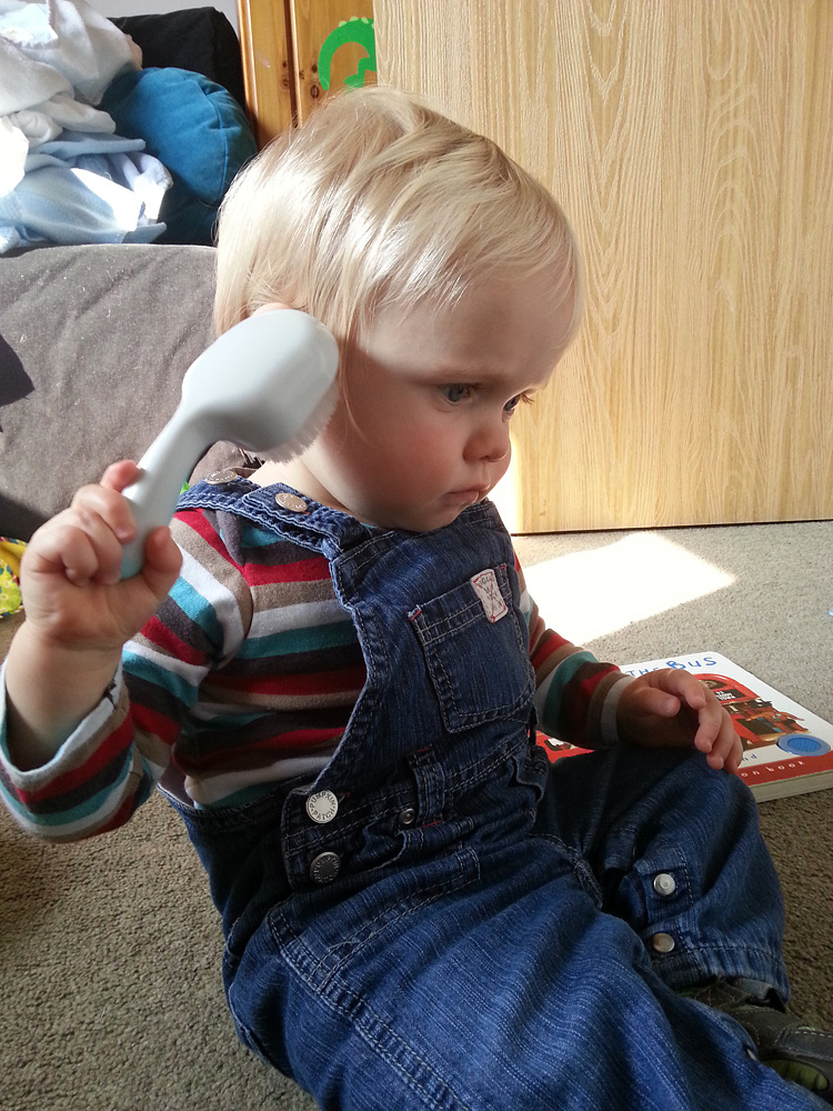 CJ was being his normal helpful self while I was trying to pack his suitcase for are holiday. Everything I put in, he took out – so to keep him busy I handed him the hair brush.
