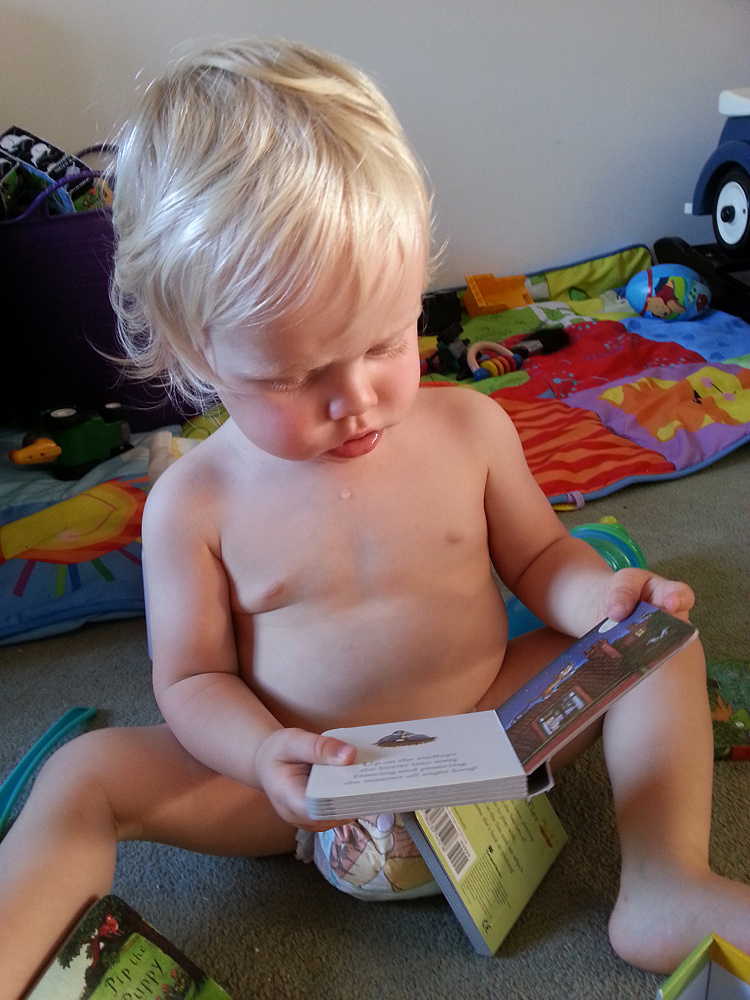 While shopping today, I brought him a new collection. We spent a long time reading them before bed. He would sit on my lap and help me turn the pages. But then he decided he wanted to do it himself – he sat there turning pages until he reached the end of the story – it was very cute to watch! Especially as he had the book upside down 🙂