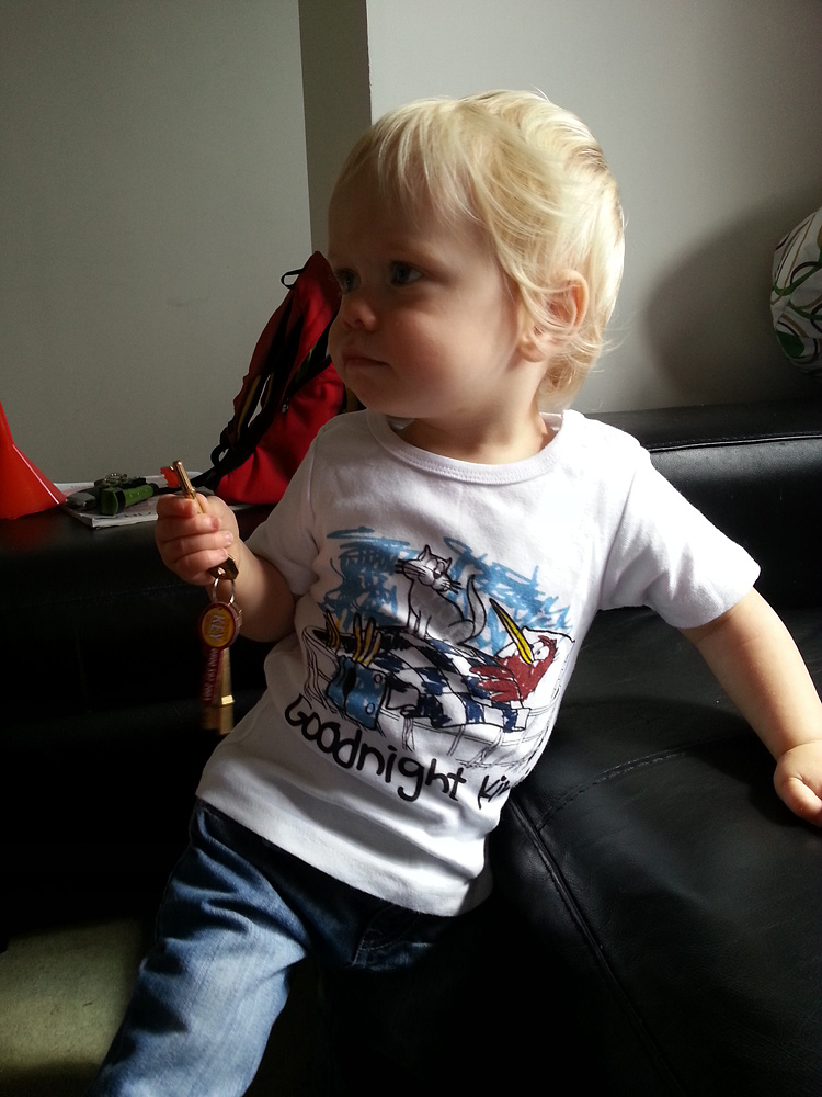 This is one of CJ’s special kiwi t-shirts. Although he doesn’t know what “Goodnight Kiwi” is, we do! And we smile in memory every time we see it.