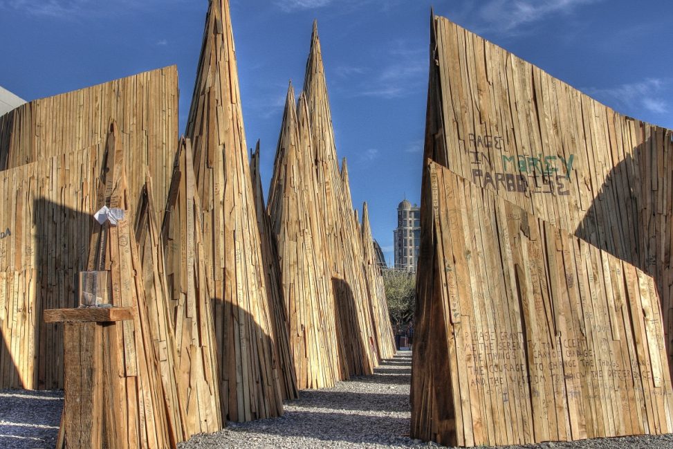This wooden structure has been built on the site of the old convention centre. It is a 40-metre long, 25-metre wide, and 6.3-metre-tall, and designed to resemble the seismic activity of the February 2011 quake and aftershocks.