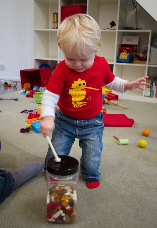 Today when we started using it as a drum, he stood up and ran away to his toy box. S2 was a little confused as CJ searched frantically and then rushed back – until he saw the drum stick in hand!