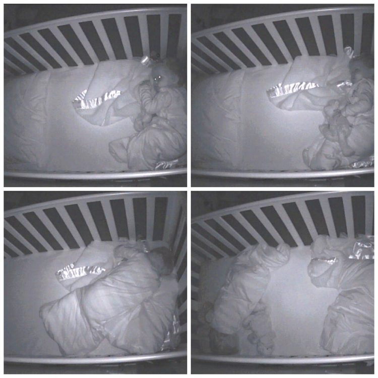 CJ is very active in his sleep and will do laps around his cot each night. Whenever I check on him during the night he is never were I left him last time and is normally facing the other way at the other end of the cot.