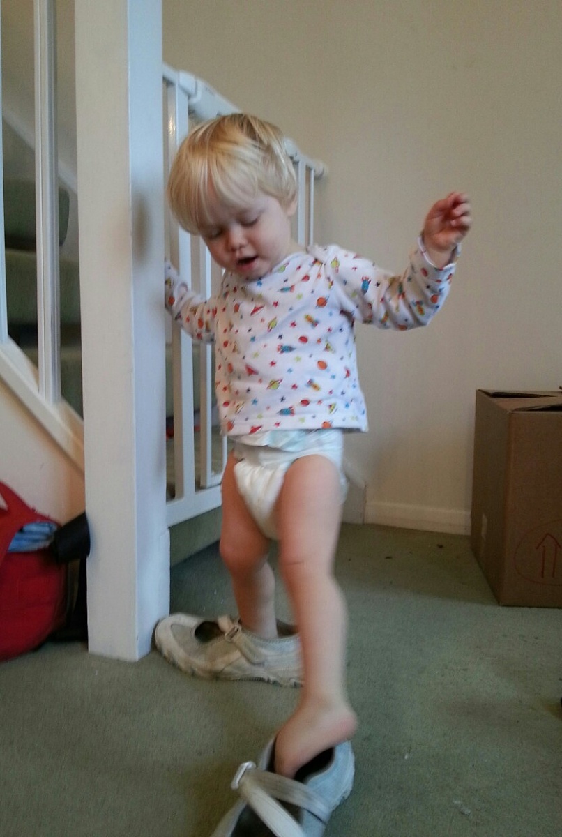 However, what followed was a lot of banging and giggling and then a slow sloppy shuffle from the door as he emerged in my shoes – tumbling and giggling away!