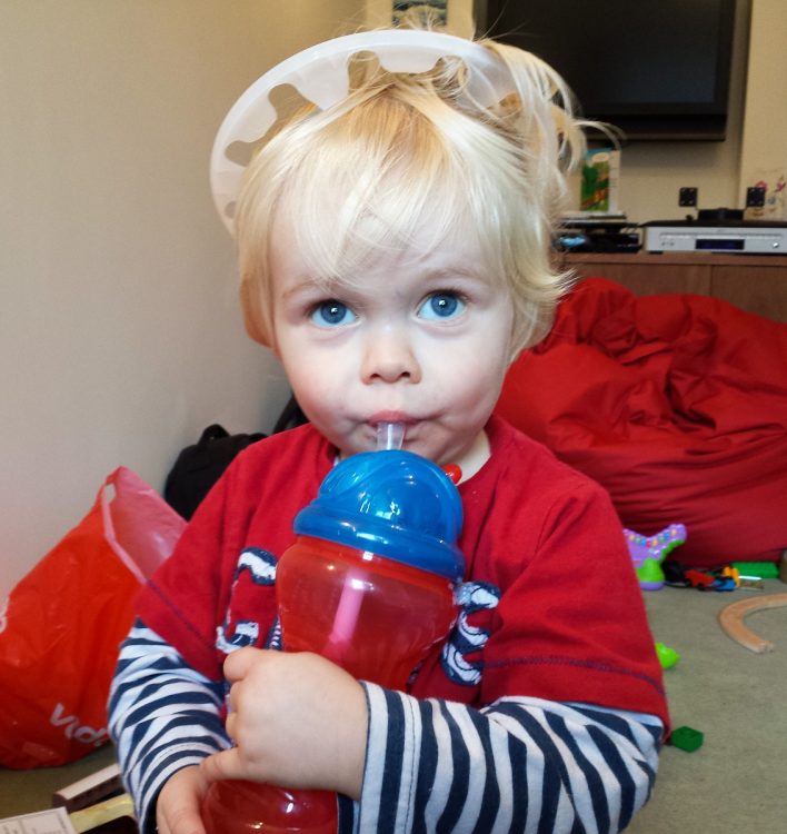 But it was the rubbish pile that he found his “toy”. It took him a while to figure out how to keep it on his head – there were quite a few failed attempts. But once he figured it out he rushed around the house to show S2 what his “Angel Child” could do!