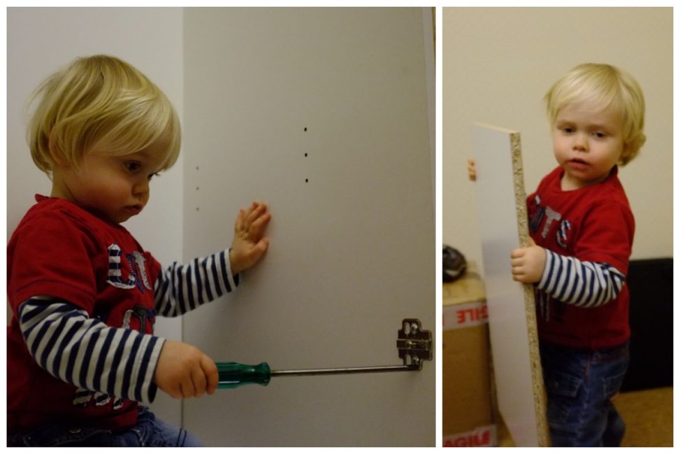 CJ proved to be a great help. He would fetch the screws, the shelves, the doweling, the screwdriver or anything else that S2 needed. He was even allowed to put the doweling and screws in the holes.