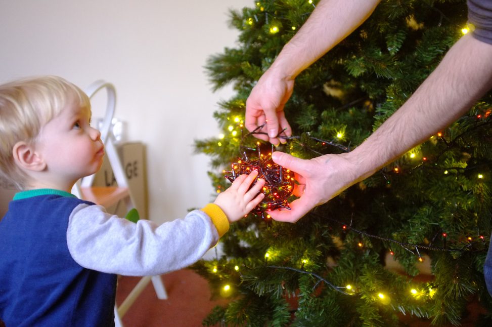 The first job was to hang the lights – CJ was fascinated! S2 walking round and round the tree, climbing on the ladder to reach the top, then starting over again. And it wasn’t long before he wanted to help!