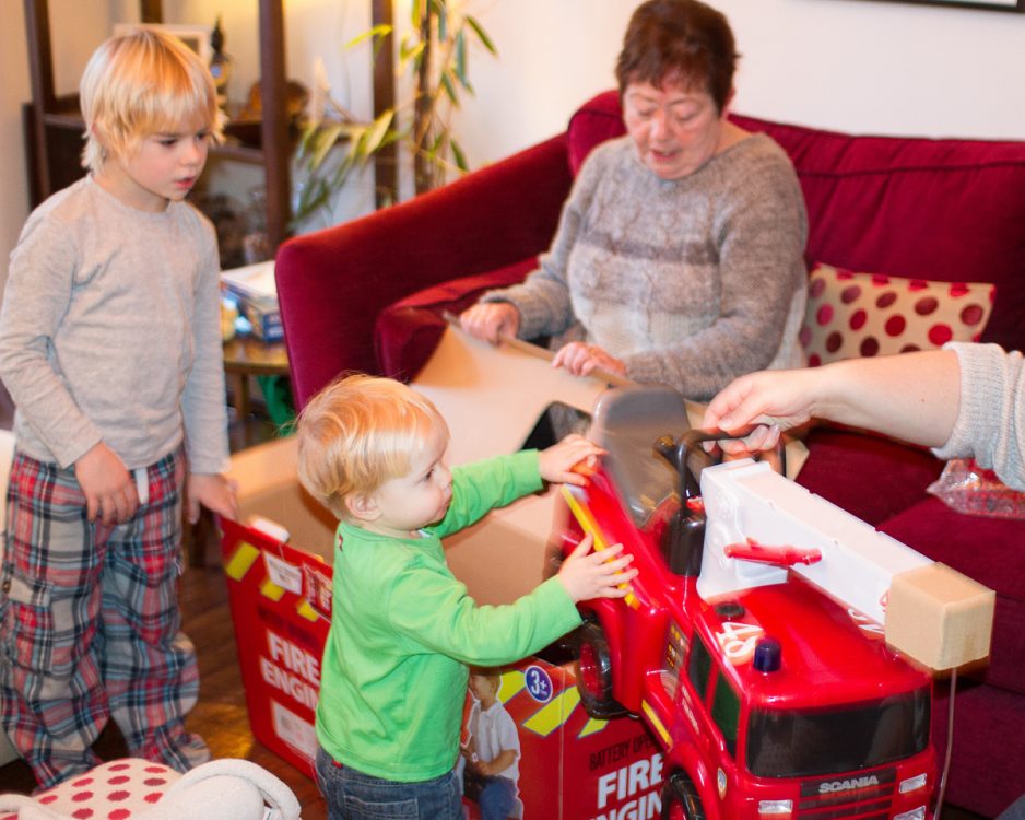 After sleeping the whole way back, CJ was on great form when we arrived. After unpacking the cars, we unwrapped some more presents. CJ was very spoilt by F&V&R&I – they gave him a ride on fire truck, which has a mechanical ladder arm that moves up & down and side to side. But it’s party trick is that it sprays water from its hose! After starting off a bit hesitant, he now loves it.