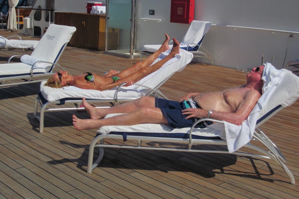 We will be cruising at full speed for 10 days, less our time in 5 different Ports at about 8 hours each. That is a lot of time at sea, and, for some passengers, a lot of time enjoying the sunshine.