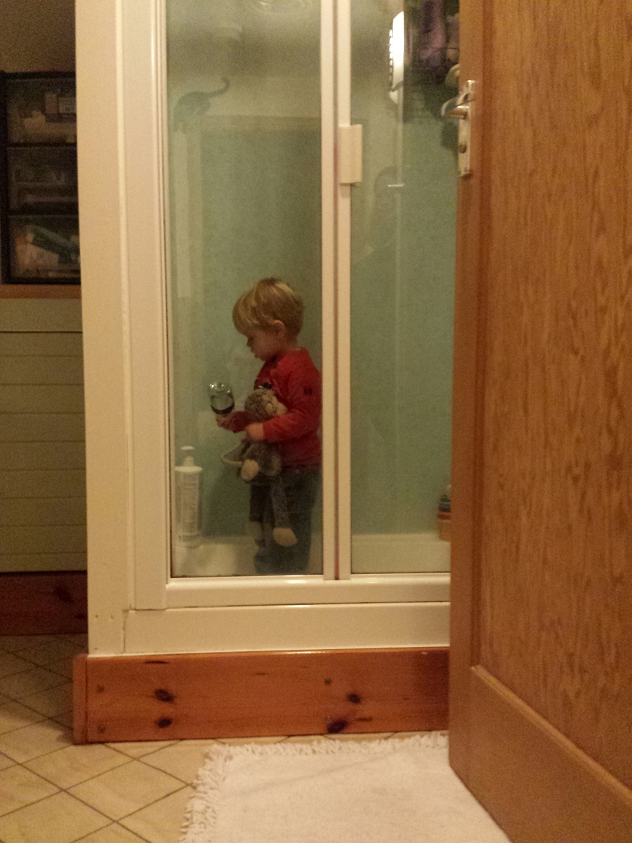 We said to him tonight, “would you like a shower?”