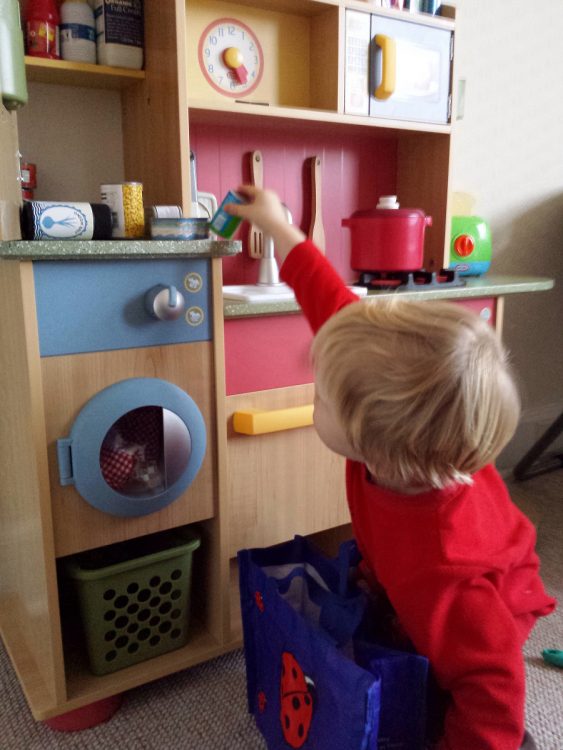 However, we did have some play sessions – CJ was particularly taken with the idea of putting his shopping away in his kitchen! Thanks again N for the great kids tesco bag filled with kid size items – a great way to keep a boy amused!